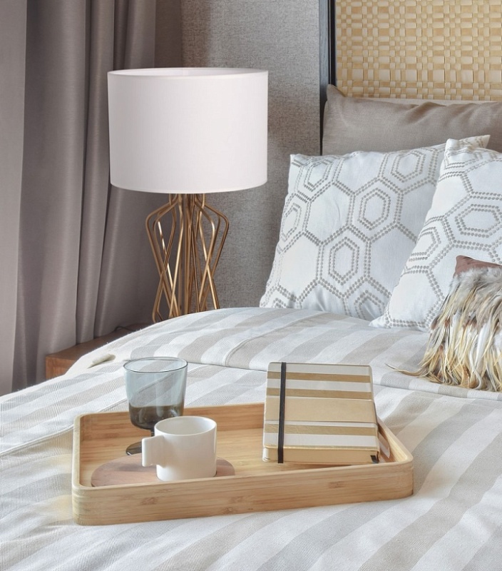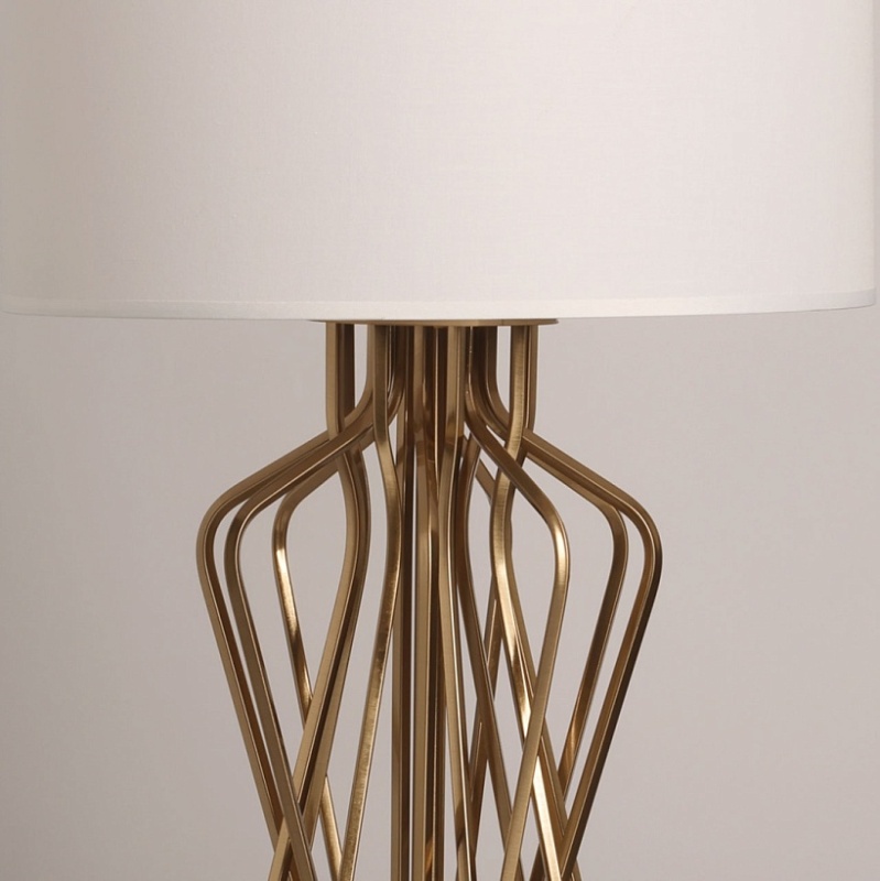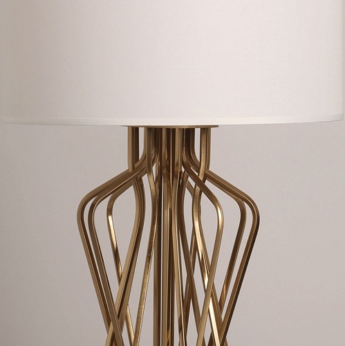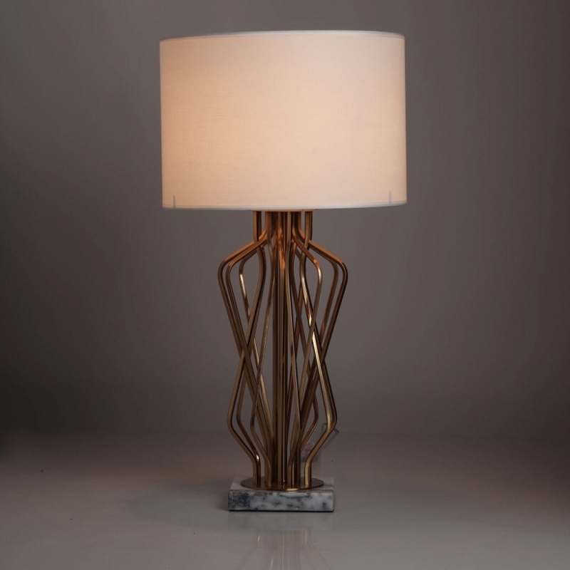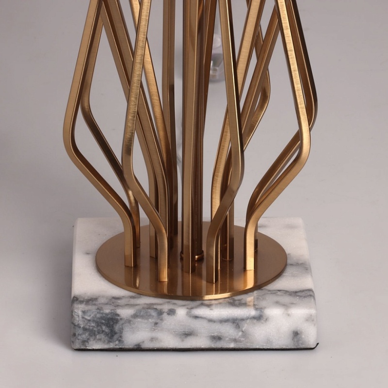 Металлическое основание настольной лампы гальванизировано в цвет медовой бронзы. Заменяемые источники света закрыты двухслойным абажуром, где внутренний слой из прозрачного термостойкого акрила, а внешний - из белого текстиля. В основании настольной лампы используется натуральный мрамор белого цвета.