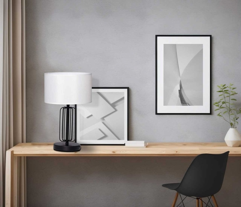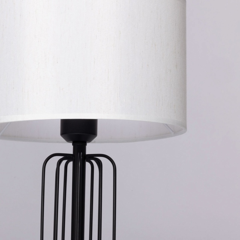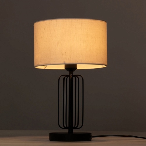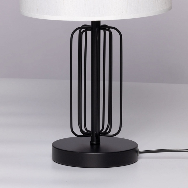 Металлическое основание настольной лампы окрашено в черный цвет. Традиционный источник света закрыт двухслойным текстильным абажуром белого цвета. С внутренней стороны текстиль защищен термостойким акрилом. Абажур прошит.