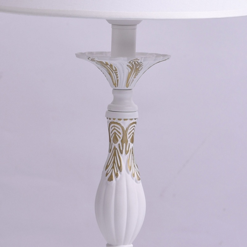 Арматура настольной лампы выполнена из комбинации сплавов металлов и обработана по технологии ручного окрашивания: основной защитный слой белого матового цвета, затем вручную окрашены выступающие части орнамента. Основание светильника выполнено из сплава железа по технологии прессования. Стержень и декоративная розетка выполнены из сплава алюминия с цинком по технологии художественного литья в кокиль под давлением.