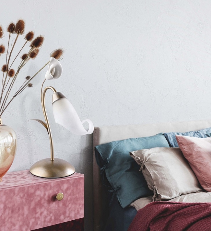 Основание светильника выполнено из металла и окрашено в цвет перламутрового золота. Плафон выполнен вручную из алебастрового стекла. Настольная лампа декорирована пластиком белого цвета.