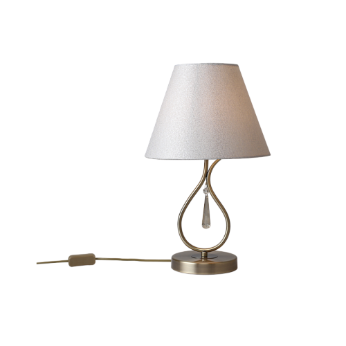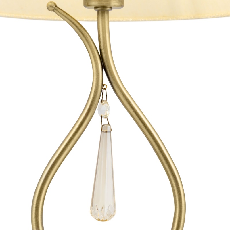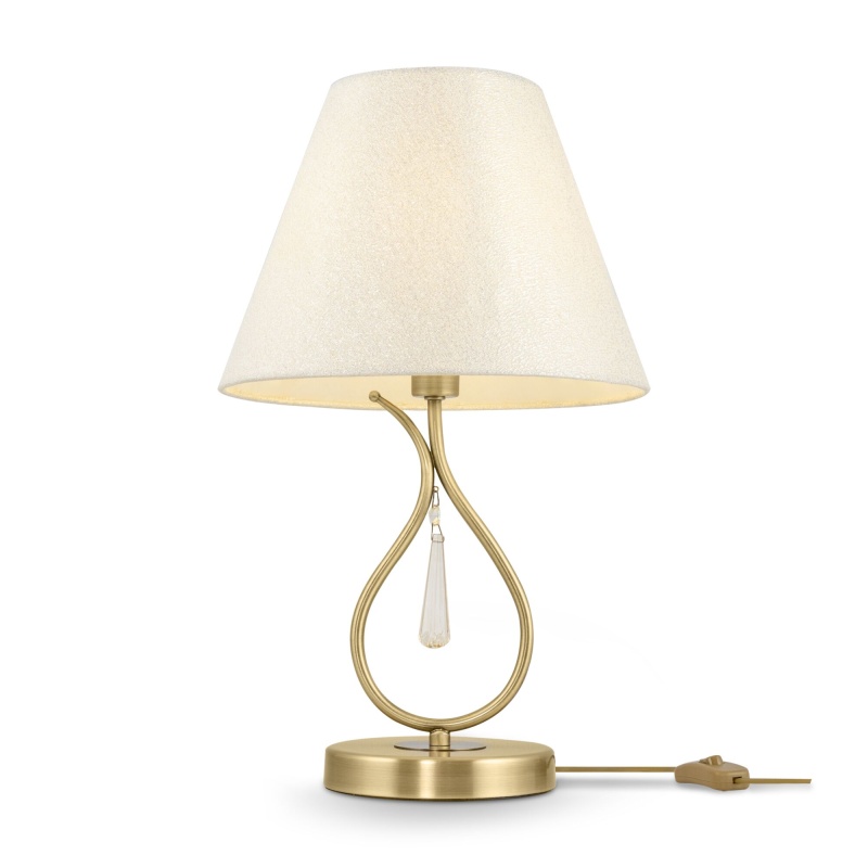 Металлическая арматура. Цвет – латунь. Абажуры из фактурной ткани белого цвета. Декор – хрустальные подвесы каплевидной формы. Одиночный подвес и торшер с цоколем Е27, лампа, бра и люстры – Е14.