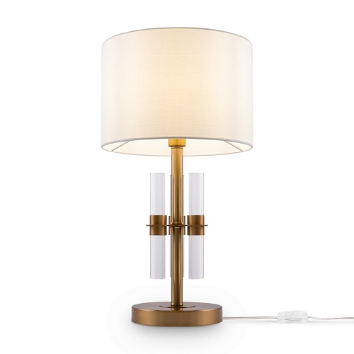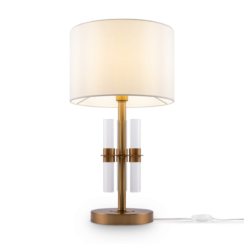 Металлическая арматура. Цвет – латунь. Тканевые абажуры белого оттенка. Декор – прозрачные акриловые трубки. Трендовая комбинация фактур и материалов. Широкий ассортимент. Торшер и подвес с цоколем Е27, лампа, бра и люстры – Е14.