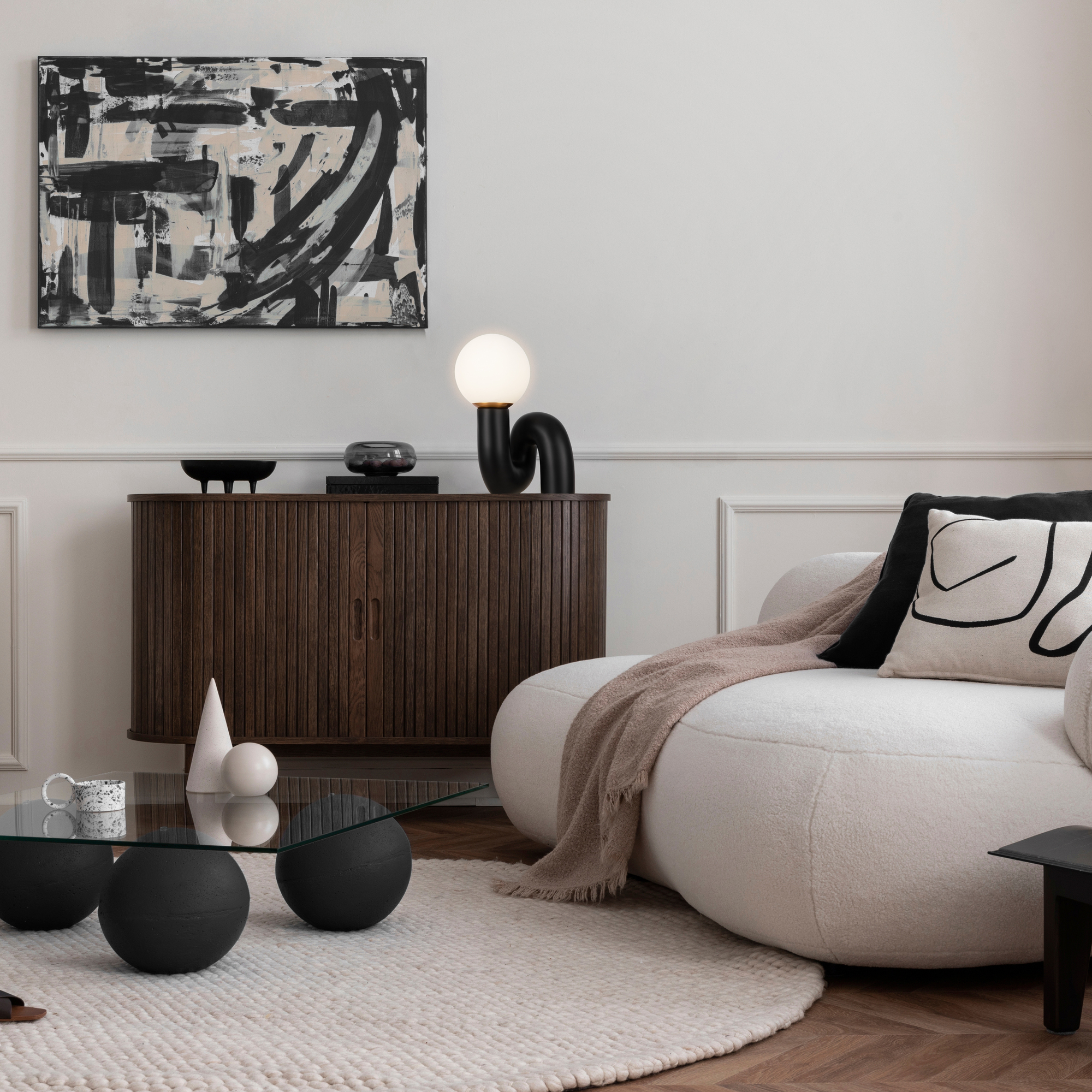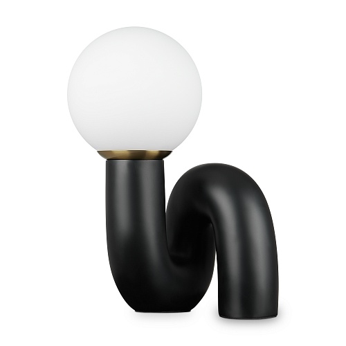 Изогнутое основание светильника выполнено из полирезина, цвет — черный. Плафон-сфера из белого матового стекла создает мягкий заливающий свет. Дизайн светильника воплощает в себе предмет искусства. Источник света — лампа с цоколем E14.