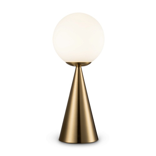 Материал арматуры — металл, цвета - латунь, черный. Плафон-сфера из белого матового цвета. Функция touch-dimming позволяет регулировать яркость света. Источник света - лампа с цоколем Е14.