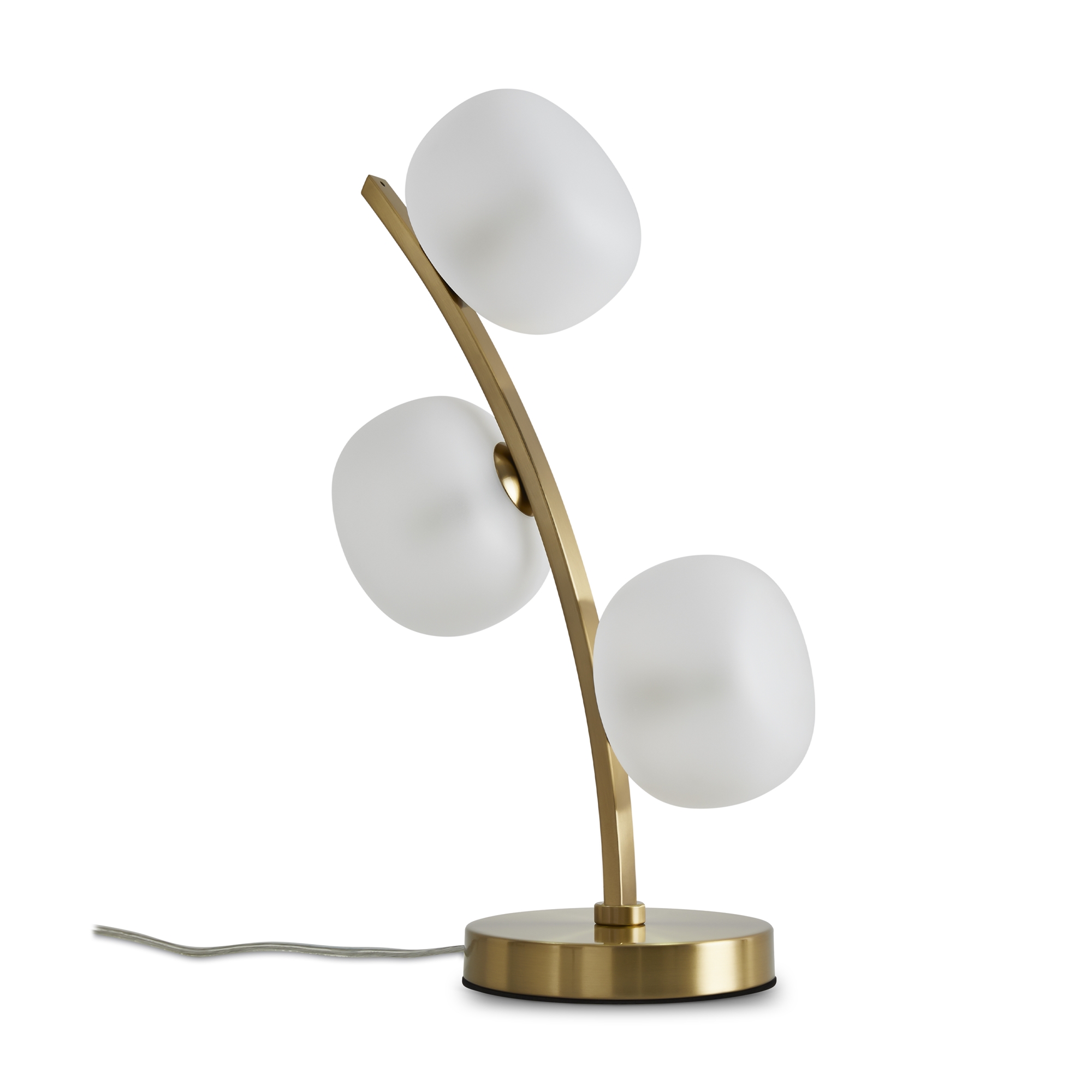 Арматура - металл. Цвет арматуры - латунь. Серия с необычной формой плафонов — немного приплюснутые, матовые белые. Настольные лампы и настенные бра выгнутой формы. Источник света лампа. Цоколь G9.