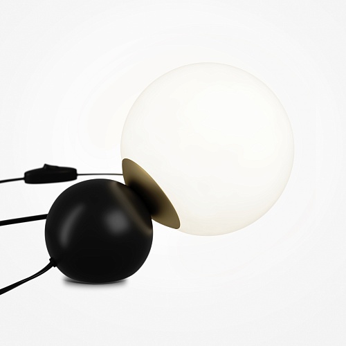 Арматура из металла в цвете матового золота. Плафоны-сферы из матового выдувного стекла. Модная асимметрия в дизайне. Источник света — лампы с цоколем Е14.