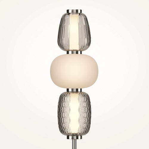 Металлическая арматура, цвет - золото, хром. Микс плафонов округлых и вытянутых форм из белого матового и прозрачного стекла с сетчатым и с линейным повторяющимся рельефным рисунком. Регулируемая высота подвесных моделей, провод - 3 метра. LED-источник света, цветовая температура 3000К.
