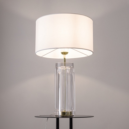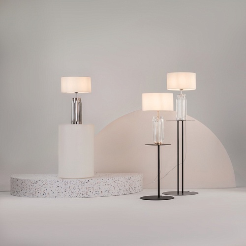 Металлическое основание - дополнено скульптурным литым стеклом в трех оттенках: прозрачном, дымчатом и пудрово-розовом. Хлопковый абажур белого цвета. Цоколь Е27.