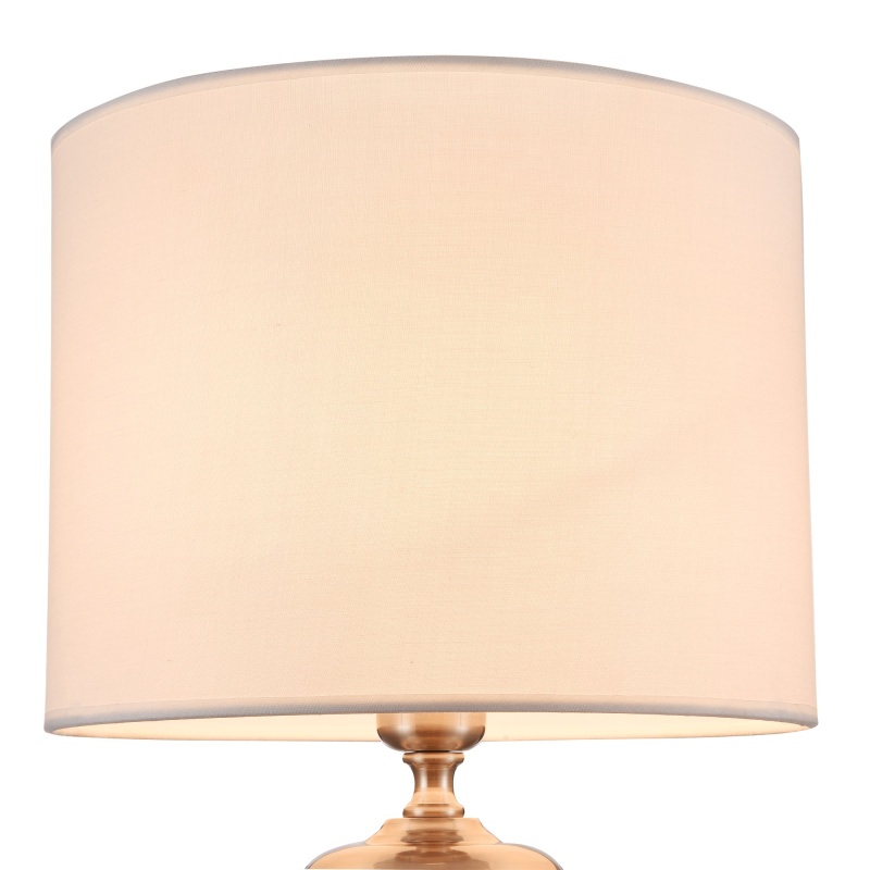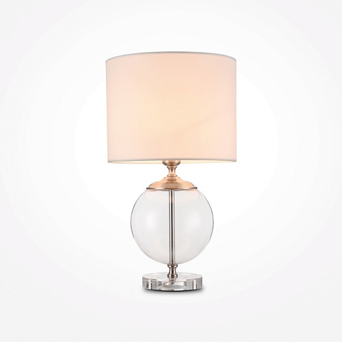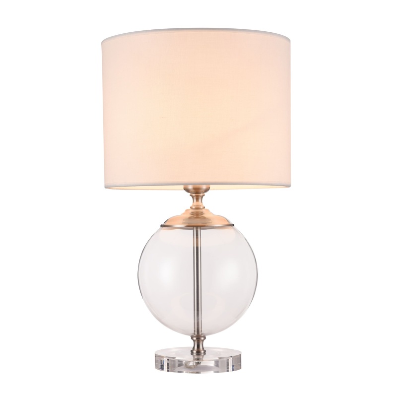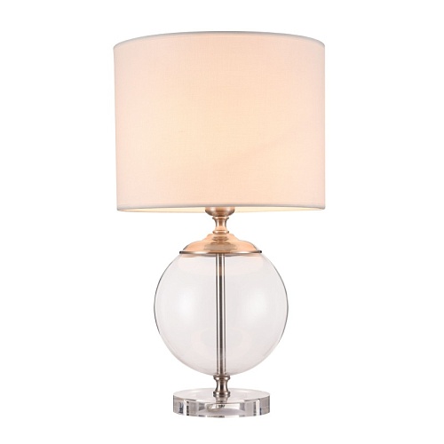 Материал арматуры – металл, цвет – никель. Абажур – кремовый текстиль на ПВХ. Основание – прозрачный акрил. Декор – шар из выдувного стекла.