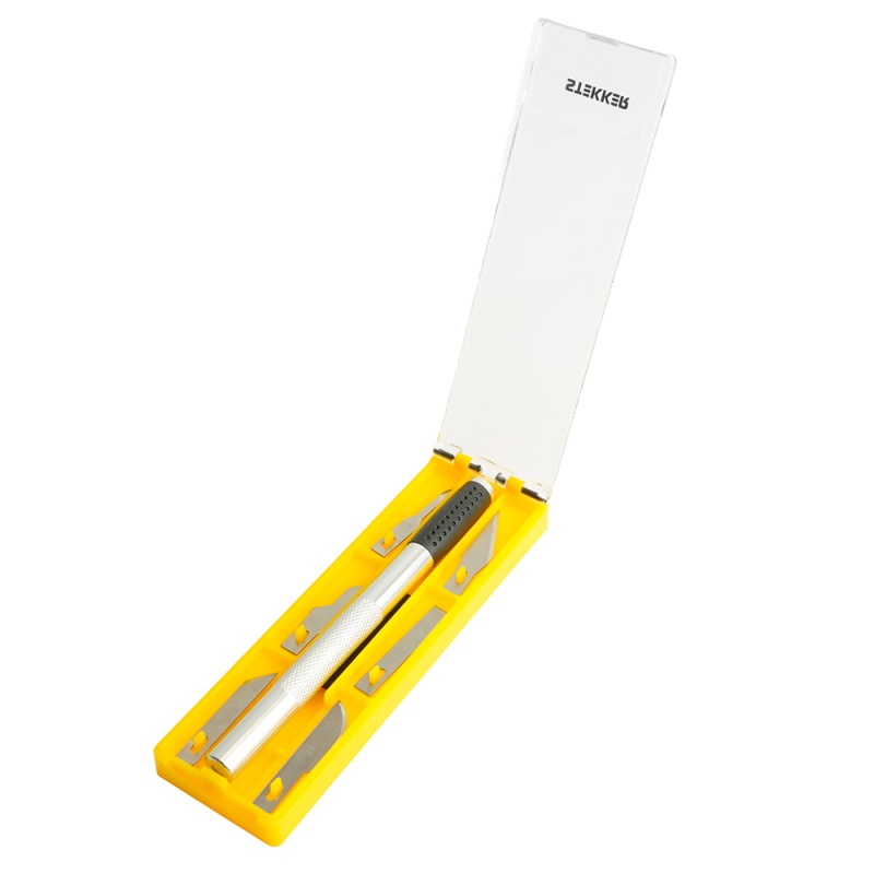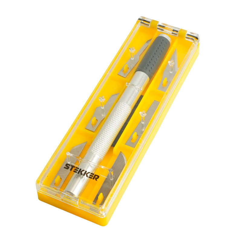 Нож макетный с алюминиевой рукояткой, 0,5 мм, кейс, 6 лезвий в комплекте, STEKKER KMU-41-S