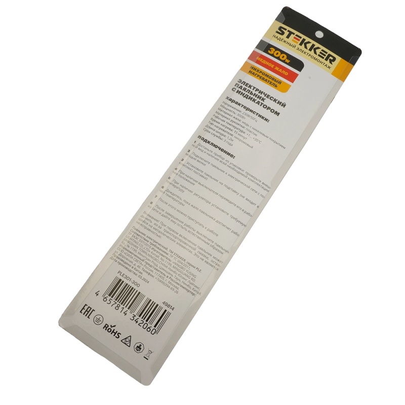 Характеристики Паяльник с индикатором 300W, нихромовый нагреватель, долговечное жало, 230В, STEKKER PLE301-300