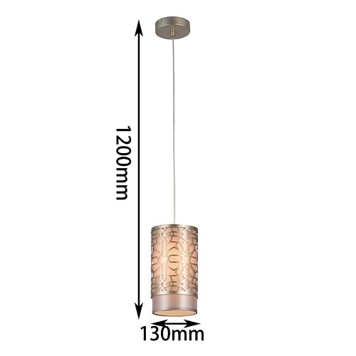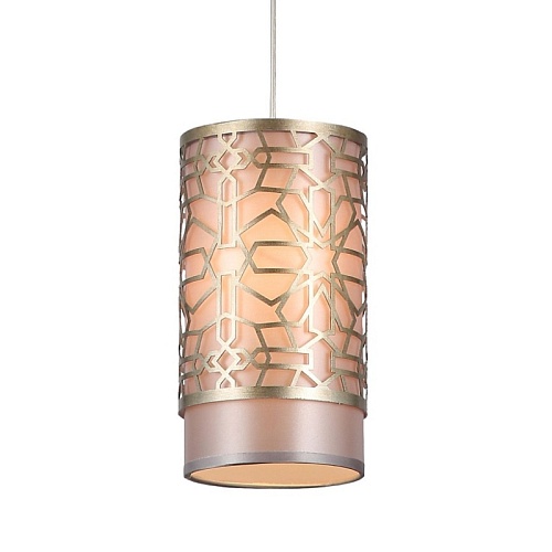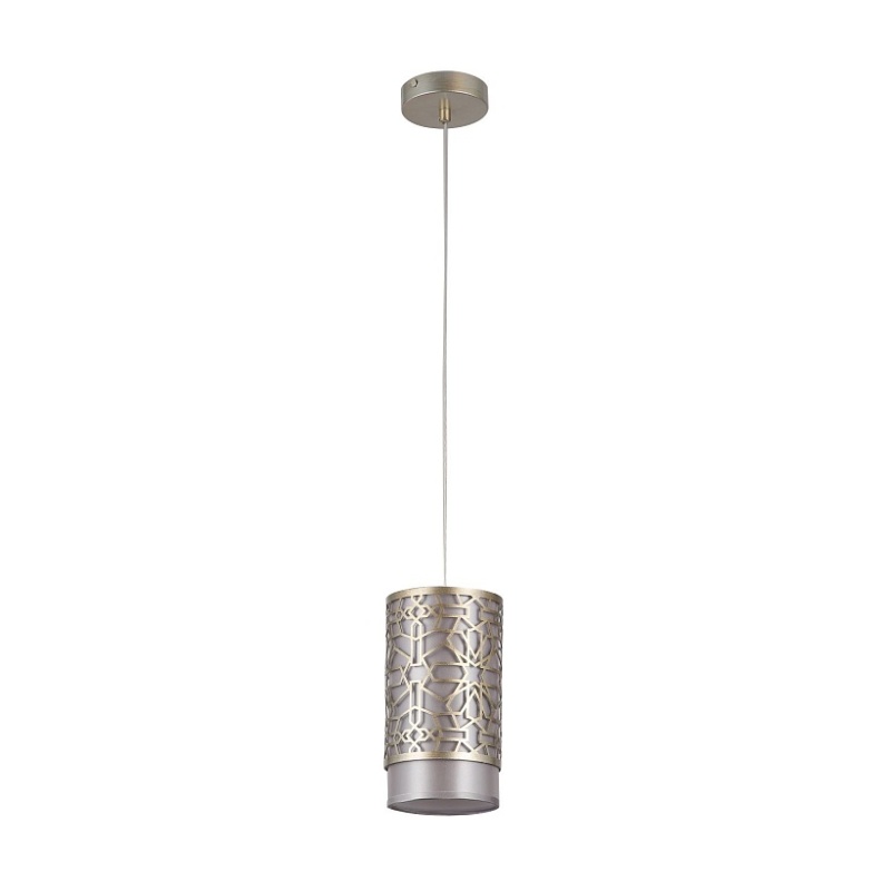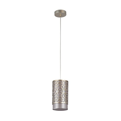 каркас цвета матового серебра, плафон из серебристо-серой ткани, декоративный элемент в виде узорной пластины матового серебристого цвета