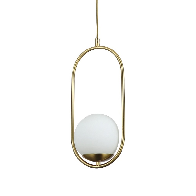 Металлический каркас цвета латуни, плафон из белого матового стекла, регулируемая высота.