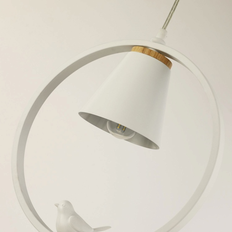 Металлический каркас матового белого цвета, декоративные вставки из светлого дерева, декоративный элемент в виде белой акриловой птицы, регулируемая высота.