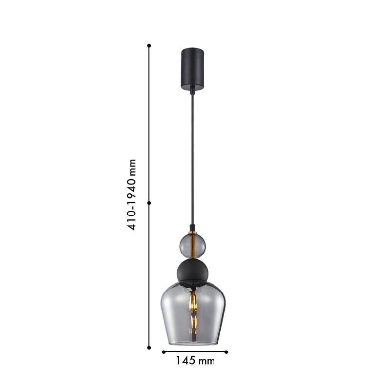 Металлический каркас черного цвета, выдувной плафон из дымчато-серого стекла, декоративный элемент в черном цвете, цоколь E27, регулируемая высота.