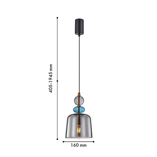 Металлический каркас черного цвета, выдувной плафон из дымчато-серого стекла, декоративный элемент в синем цвете, цоколь E27, регулируемая высота.