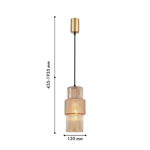 Подвес с каркасом в цвете латунь, плафон из стекла в янтарном цвете имеет вертикальные линии и ребристую текстуру с "поясом" из ромбиков поясом по центру. Цоколь E27, регулируемая высота.