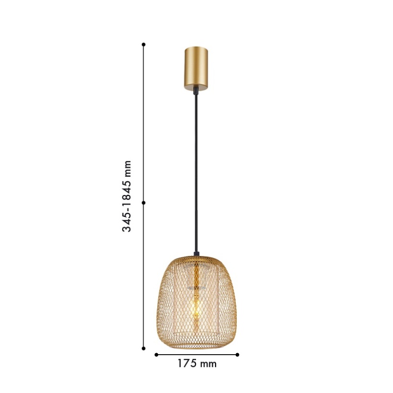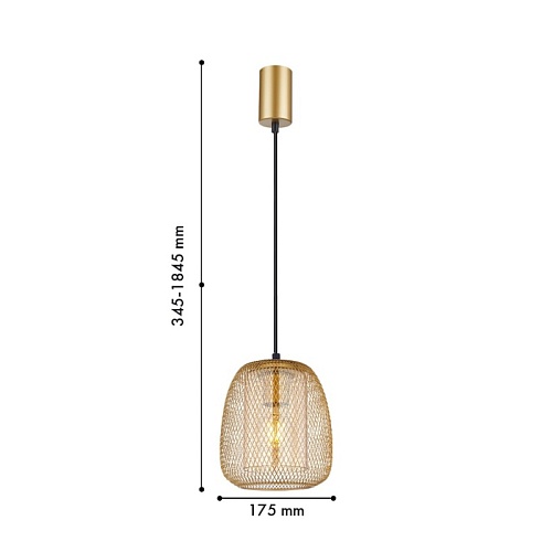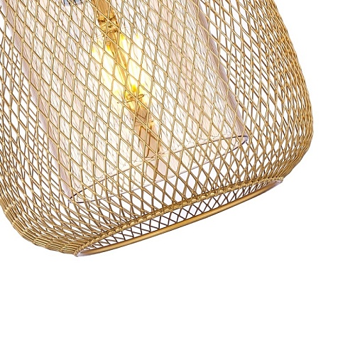 Металлически каркас золотого цвета, стеклянный прозрачный плафон внутри золотой металлической сетки, цоколь E27, регулируемая высота.