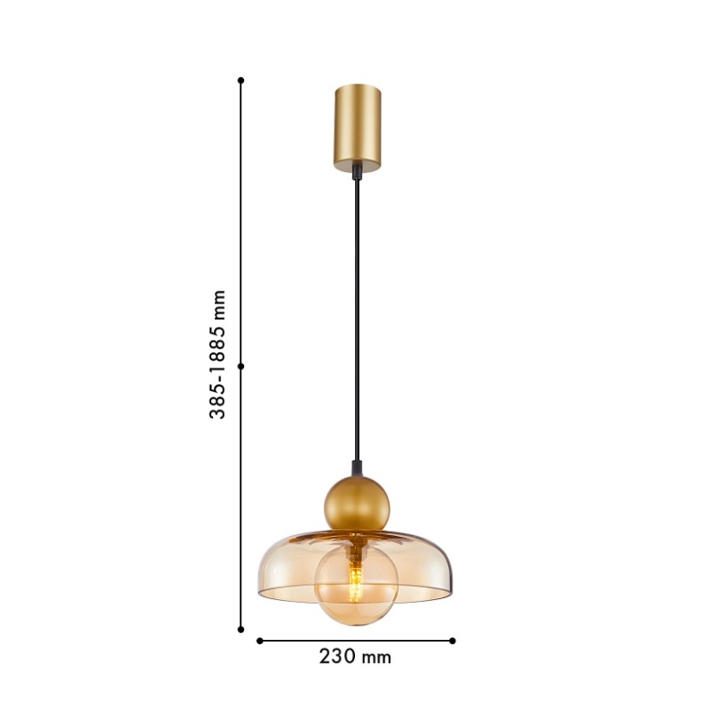 Металлический каркас в цвете матовое золото, с двумя шарами из металла и стекла, которые пересекает внешний плафоном в виде купола. Сочетание янтарного и золотого цвета, сменная лампа G9LED, регулируемая высота.
