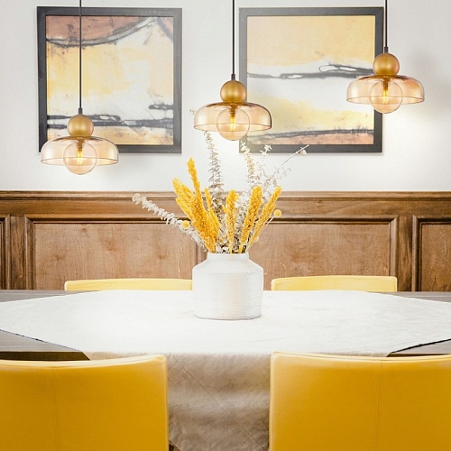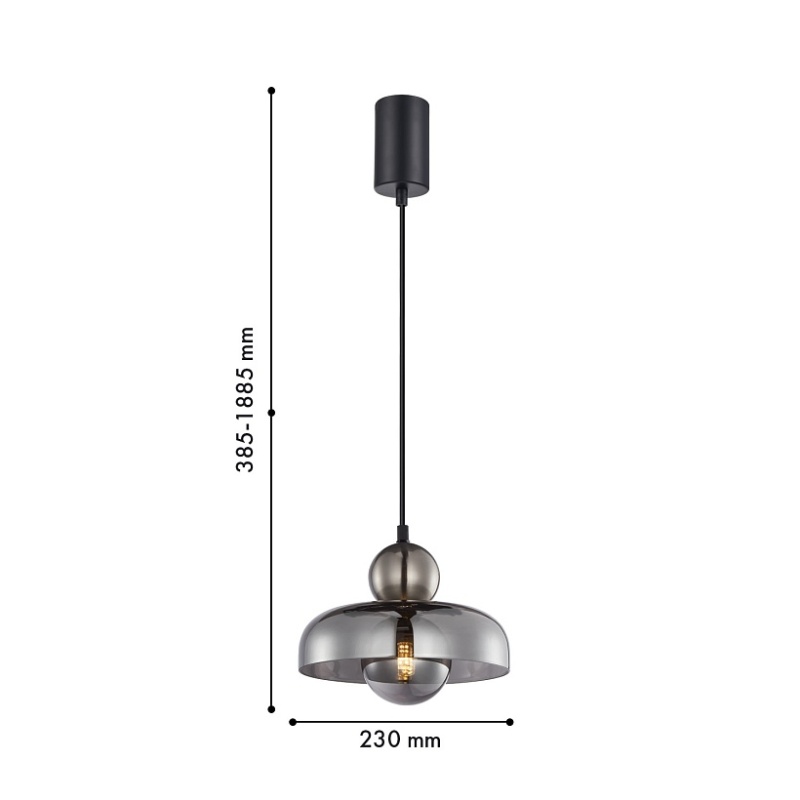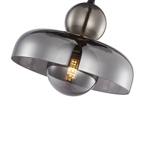 Металлический каркас в матовом черном цвете, с двумя шарами из металла и стекла, которые пересекает внешний плафон в виде купола. Сочетание черного матового каркаса и зеркально-дымчатого плафона, сменная лампа G9LED, регулируемая высота.