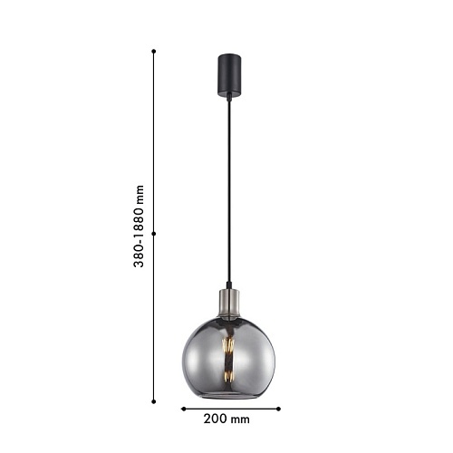 Металлический каркас черного цвета, выдувной плафон дымчато-серого цвета, цоколь Е27,сменная лампа, регулируемая высота.
