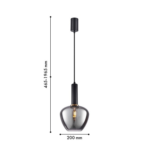 Металлический каркас в цвете латунь, выдувной плафон дымчато-серого цвета, цоколь Е27,сменная лампа, регулируемая высота.