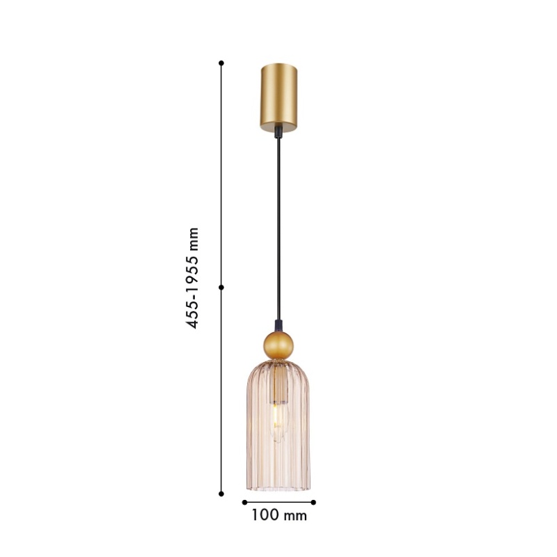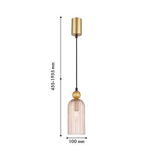 Металлический каркас золотого цвета, плафон из фактурного стекла янтарного цвета, декоративный металлический шар золотого цвета, регулируемая высота, цоколь Е14.