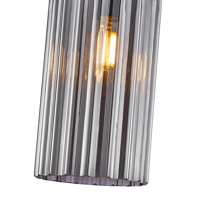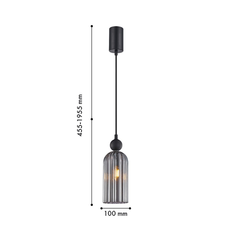 Металлический каркас черного цвета, плафон из фактурного стекла дымчато-серого цвета, декоративный металлический шар черного цвета, регулируемая высота, цоколь Е14.