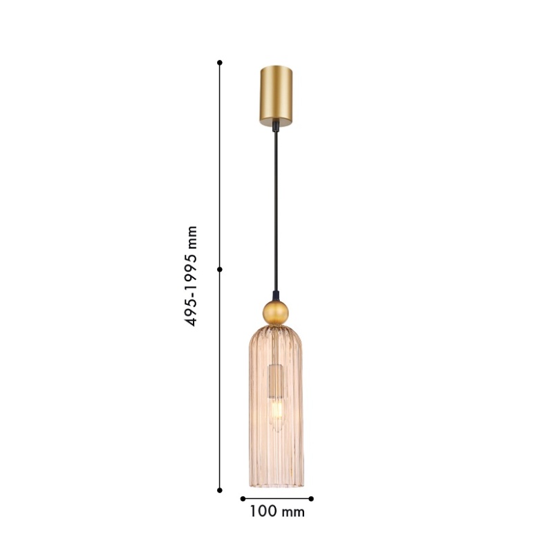 Металлический каркас золотого цвета, плафон из фактурного стекла янтарного цвета, декоративный металлический шар золотого цвета, регулируемая высота, цоколь Е14.