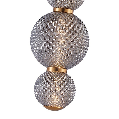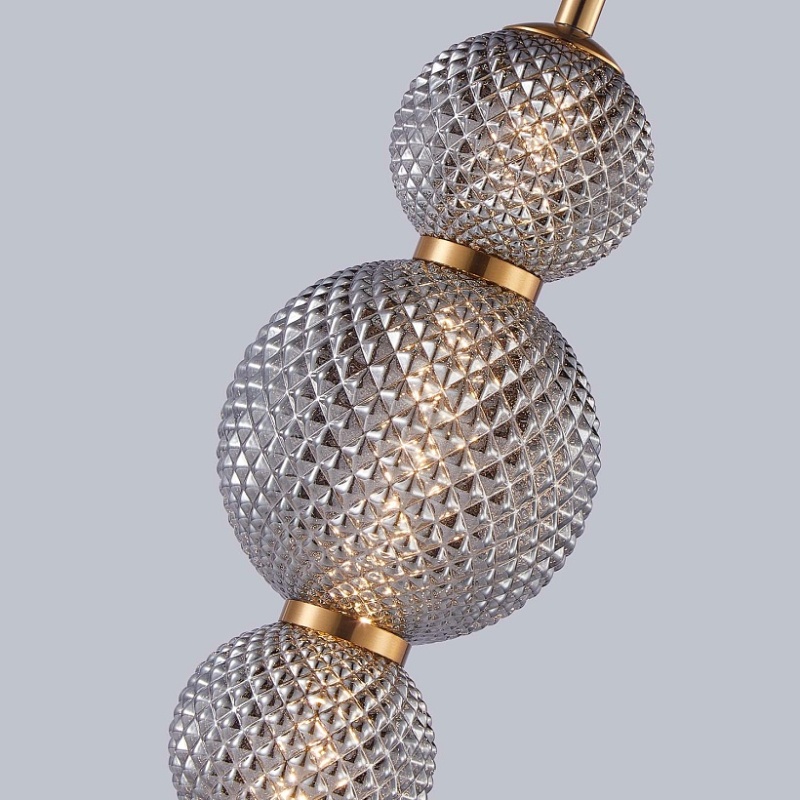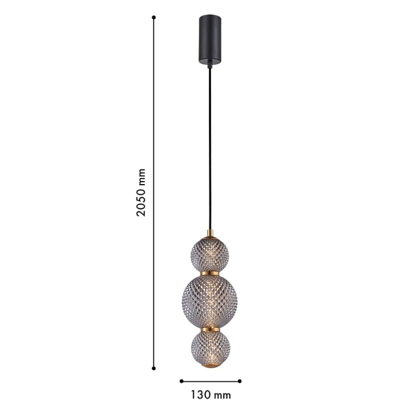 Каркас из металла черного матового цвета, плафон из фактурного стекла дымчато-серого цвета, декоративный ободок золотого цвета, регулируемая высота, LED-модуль.