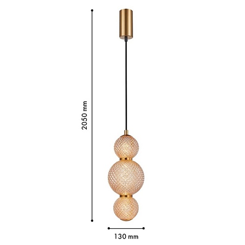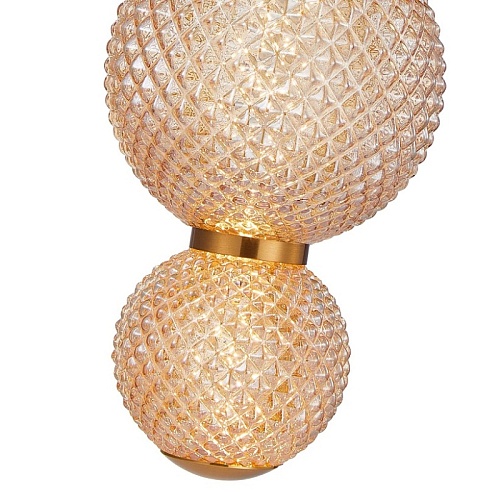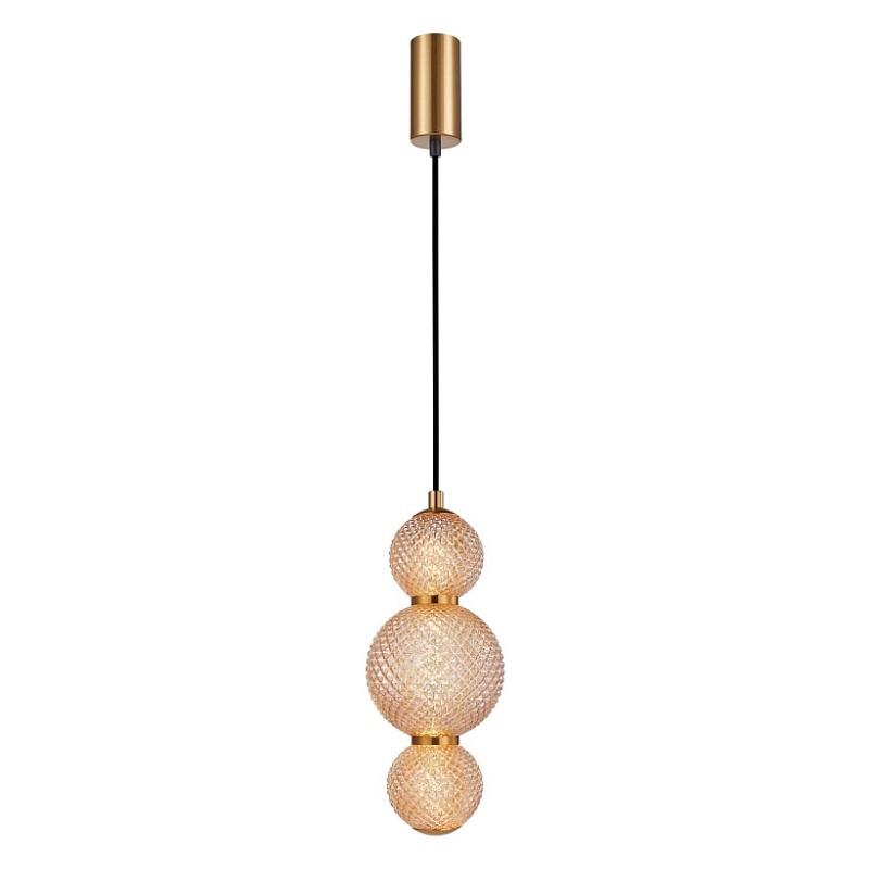 Каркас из металла цвета латунь, плафон из фактурного стекла янтарного цвета, декоративный ободок золотого цвета, регулируемая высота, LED-модуль.