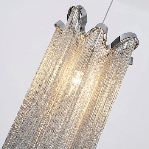 Металлический хромированный каркас, декор из серебристых цепочек, регулируемая высота, сменная лампа, цоколь Е14.