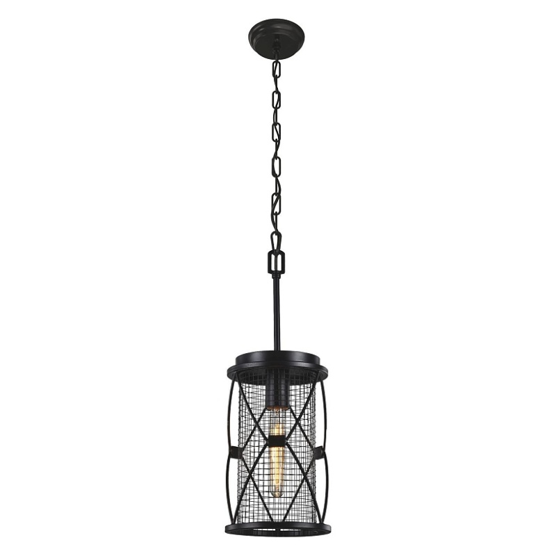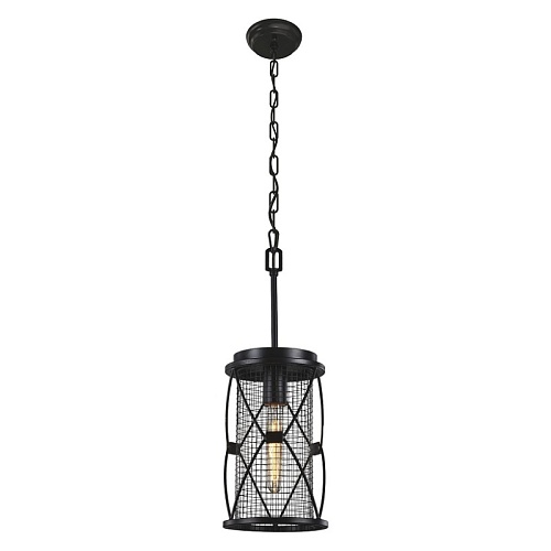 Металлический каркас черного цвета, цилиндрический плафон из черной сетки, регулируемая высота, сменные лампы.