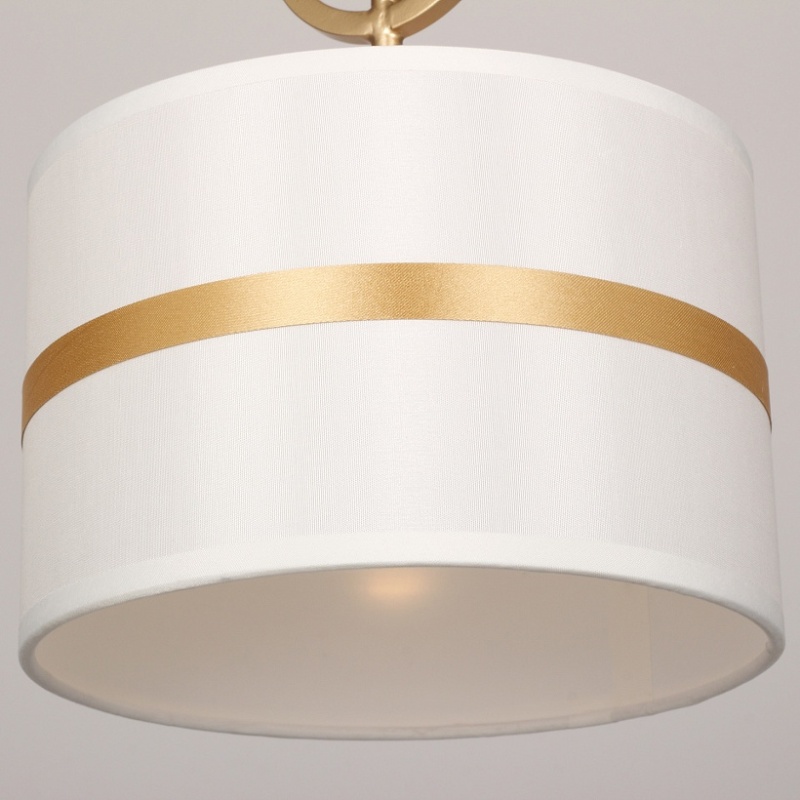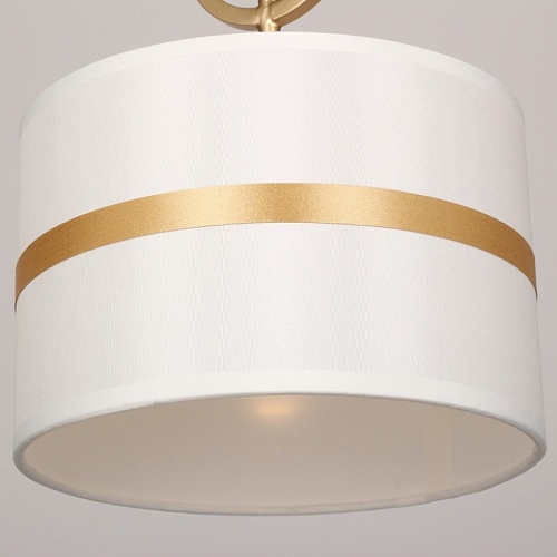 Каркас золотого цвета, абажур из белой ткани с золотистыми лентами.