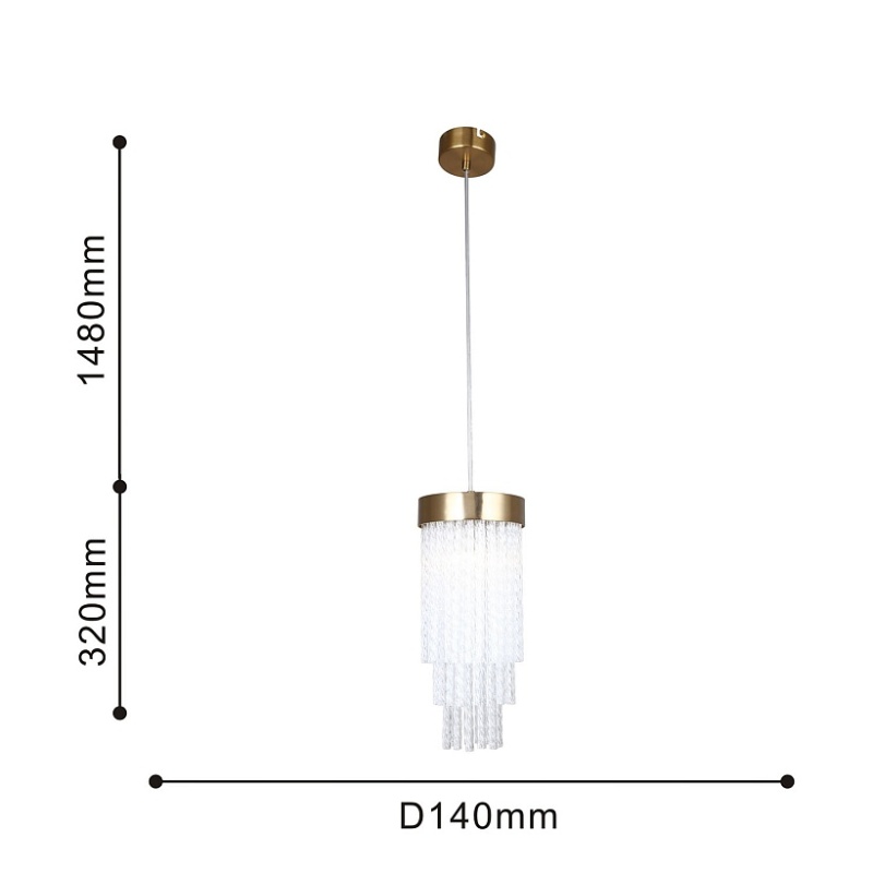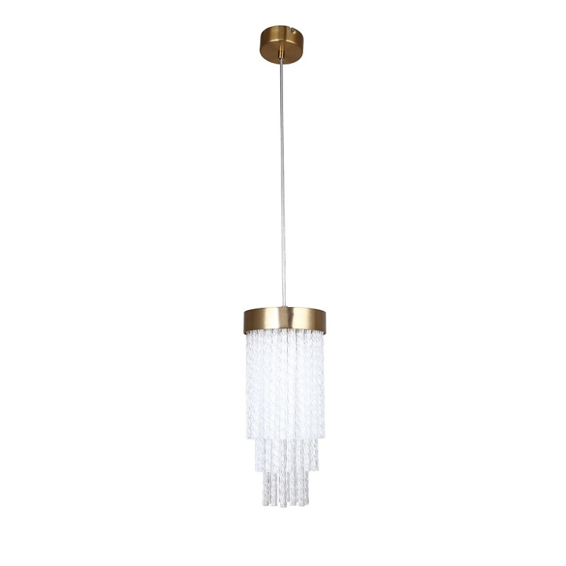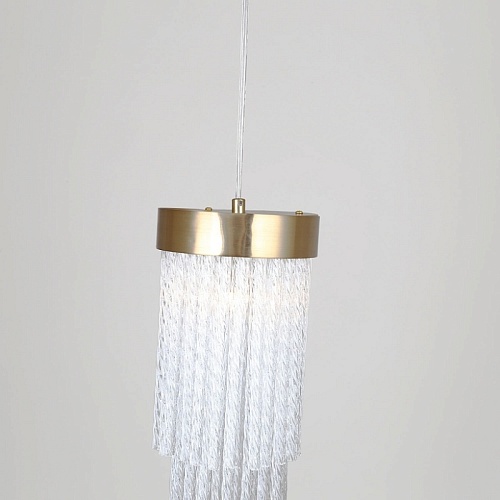 Металлический каркас цвета латунь, каскадная конструкция, декор из закрученных вокруг своей оси стеклянных трубочек регулируемая высота.