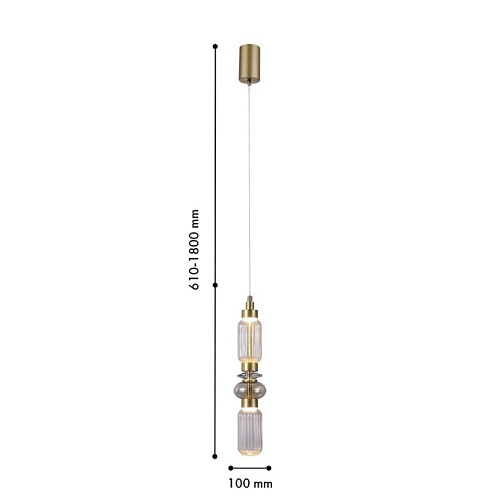 Металлический каркас в цвете латунь, плафон из стекла, выполненного по муранской технологии в прозрачном, янтарном и дымчато-сером цвете, модуль LED, регулируемая высота.