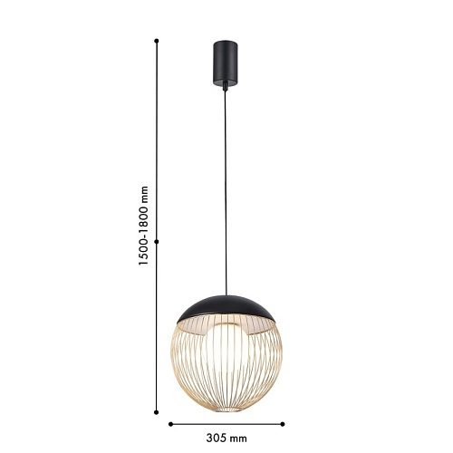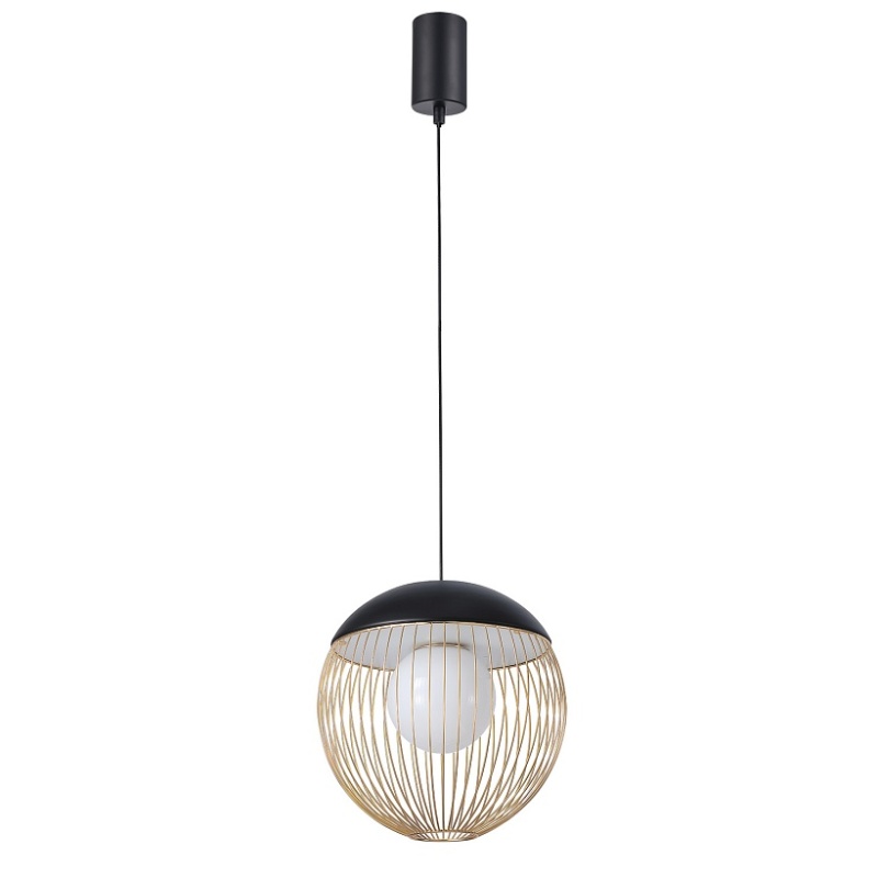 Подвес диаметром 30 см, стеклянный выдувной плафон заключен в проволочный каркас из тонких, спаянных между собой металлических трубочек, каркас в черном цвете с золотым, модуль LED, регулируемая высота.