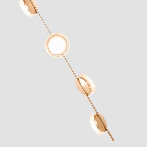 Металлический каркас золотого цвета, акриловые плафоны в виде дисков с прозрачным объемным ободком и плоской матовой внутренней частью со встроенным модулем LED, регулируемая высота.