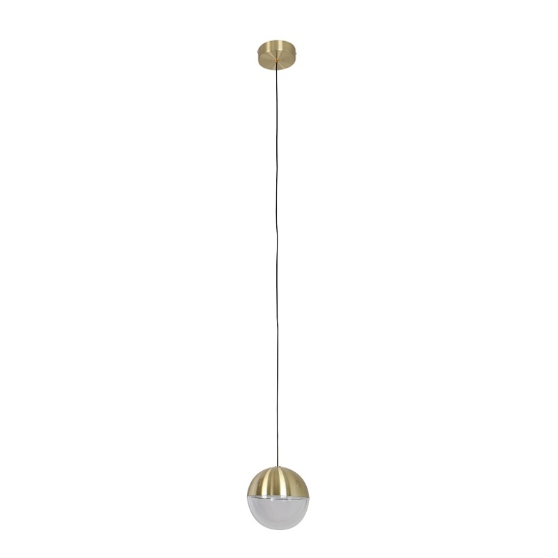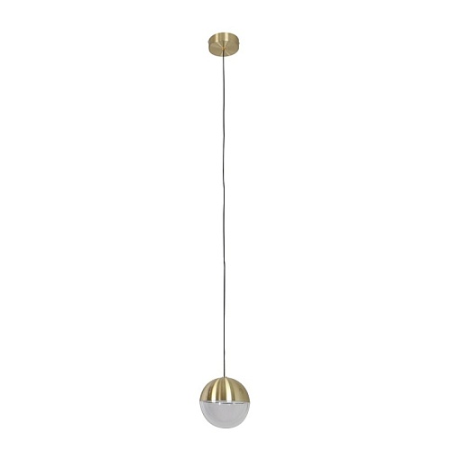 Подвес с каркасом в золотом цвете, с шарообразным плафоном, разделенным на две части — металлическую и акриловую, в центре плафона расположен LED-модуль, создающий оригинальный световой эффект, регулируемая высота.