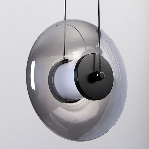 металлический каркас черного матового цвета, вертикальное крепление плоского сферического выдувного плафона из дымчато-серого стекла, по периметру сердцевины плафона расположен модуль LED, регулируемая высота.