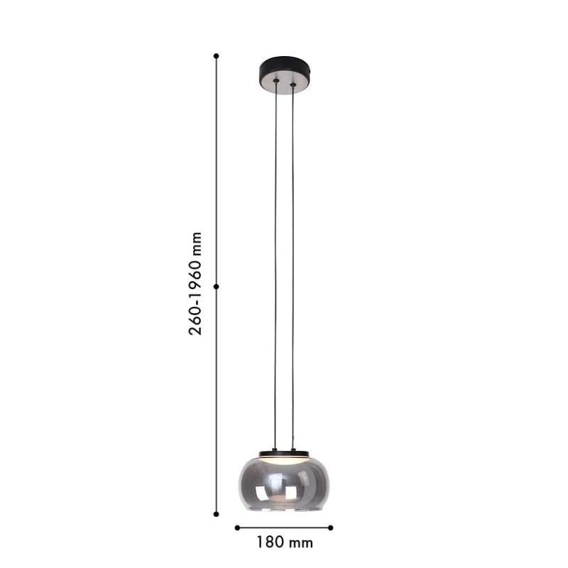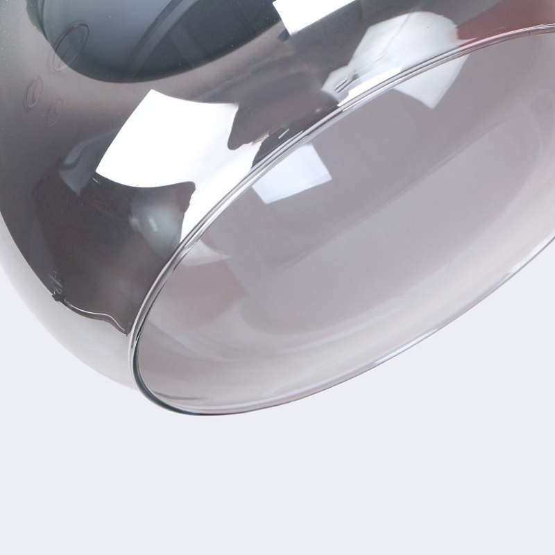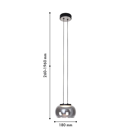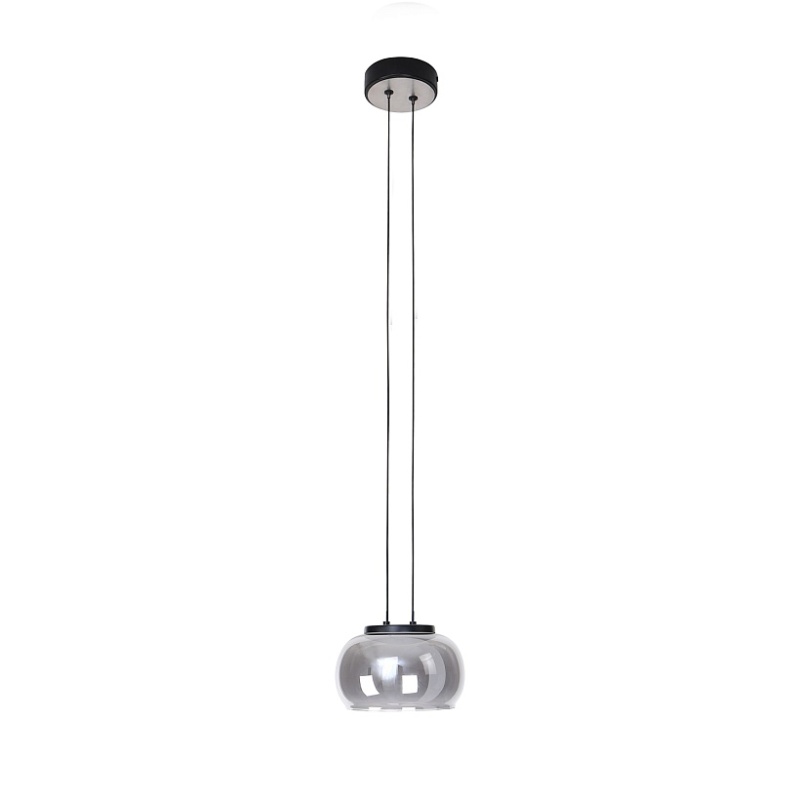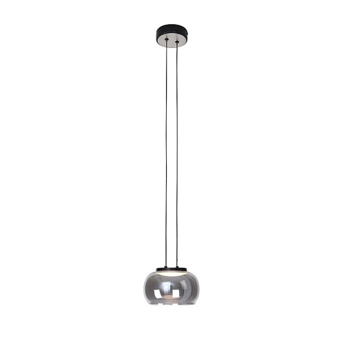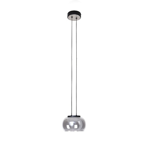 Металлический каркас черного цвета и декором в цвете никель, плафон из выдувного стекла дымчато-серого цвета, встроенный модуль LED, регулируемая высота.