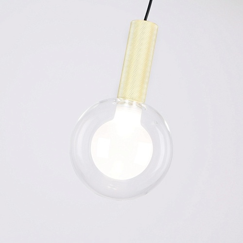 Металлический каркас в цвете матовое золото с плафоном из двойного стекла — прозрачного снаружи и матового внутри, декоративный цоколь в форме металлического цилиндра с рифленым решетчатым узором, LED-модуль, регулируемая высота.