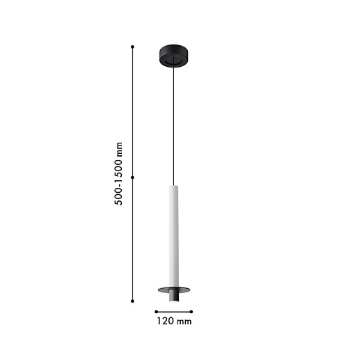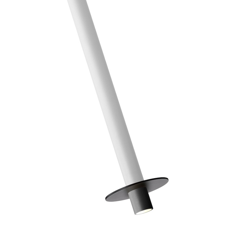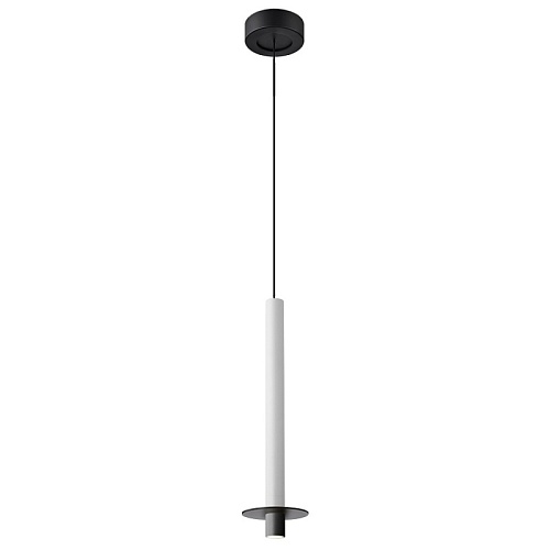 Металлический каркас черного цвета, плафон из алюминия в форме тонкого удлиненного цилиндра в белом цвете, в нижней части подвеса расположен светодиодный источник света, регулируемая высота.