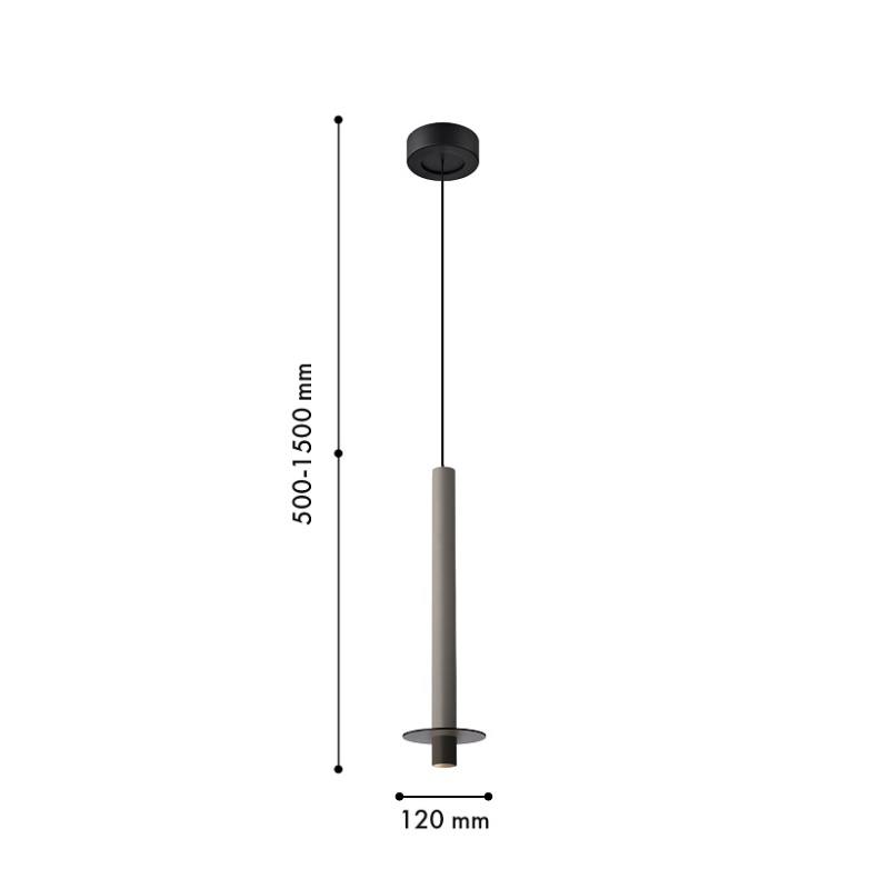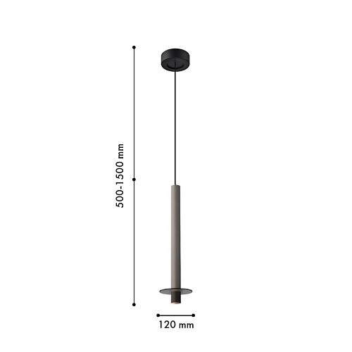 Металлический каркас черного цвета, плафон из алюминия в форме тонкого удлиненного цилиндра в сером цвете, в нижней части подвеса расположен светодиодный источник света, регулируемая высота.