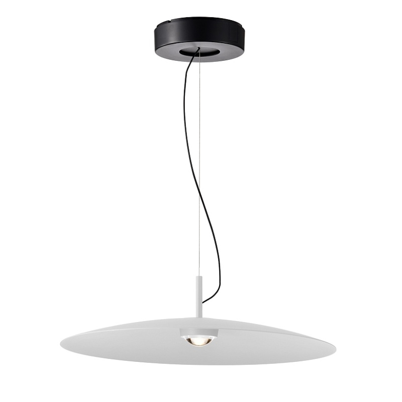 Металлический каркас черного цвета, плафон в белом цвете, диаметром 60 см, алюминиевый плафон имеет лаконичный силуэт и оснащен светодиодным источником света под акриловой лупой, регулируемая высота.