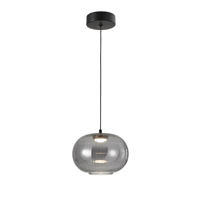 Металлический каркас черного цвета, с выдувным плафоном в виде сферы, в светлом дымчато-сером цвете , LED-модуль, регулируемая высота.