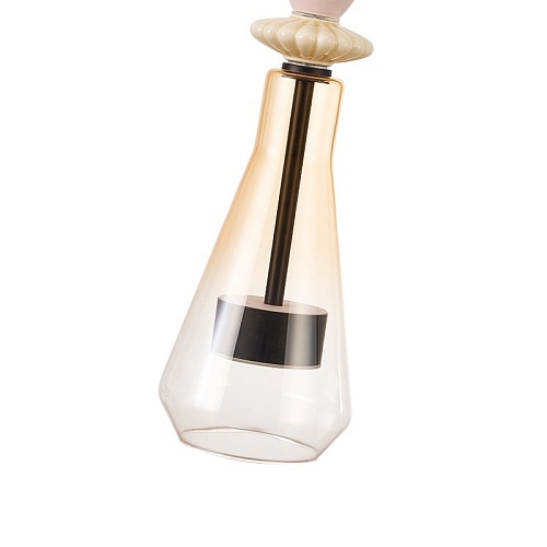 Металлический каркас черного цвета, плафон с градиентным переходом из прозрачного в янтарный цвет, изготовлен из выдувного стекла, декорирован керамическими глазурованными элементами, встроенный модуль LED, регулируемая высота.