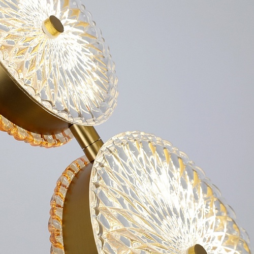 Каркас черного цвета, подвес состоит из двух плафонов разного размера, каждый плафон состоит из двух узорных стеклянных дисков прозрачного и янтарного цвета, внутри которых расположен LED-модуль, регулируемая высота.