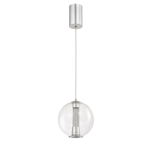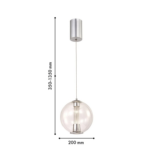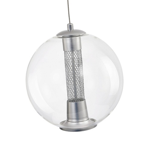 Металлический каркас серебристого цвета, конструкция плафона включает в себя выдувное стекло, украшенное внутренней декоративной металлической решеткой, модуль LED, регулируемая высота.