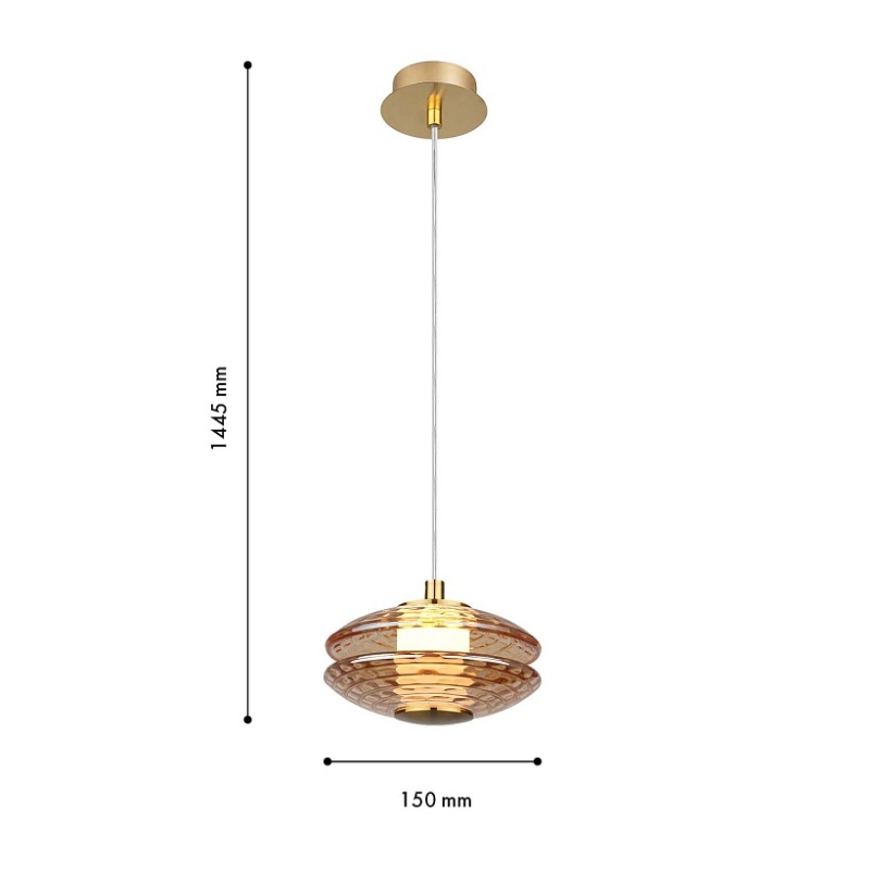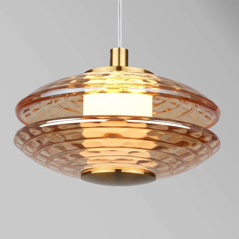 Металлический каркас цвета латунь, закругленный фактурный плафон из стекла янтарного цвета, регулируемая высота, LED-модуль.